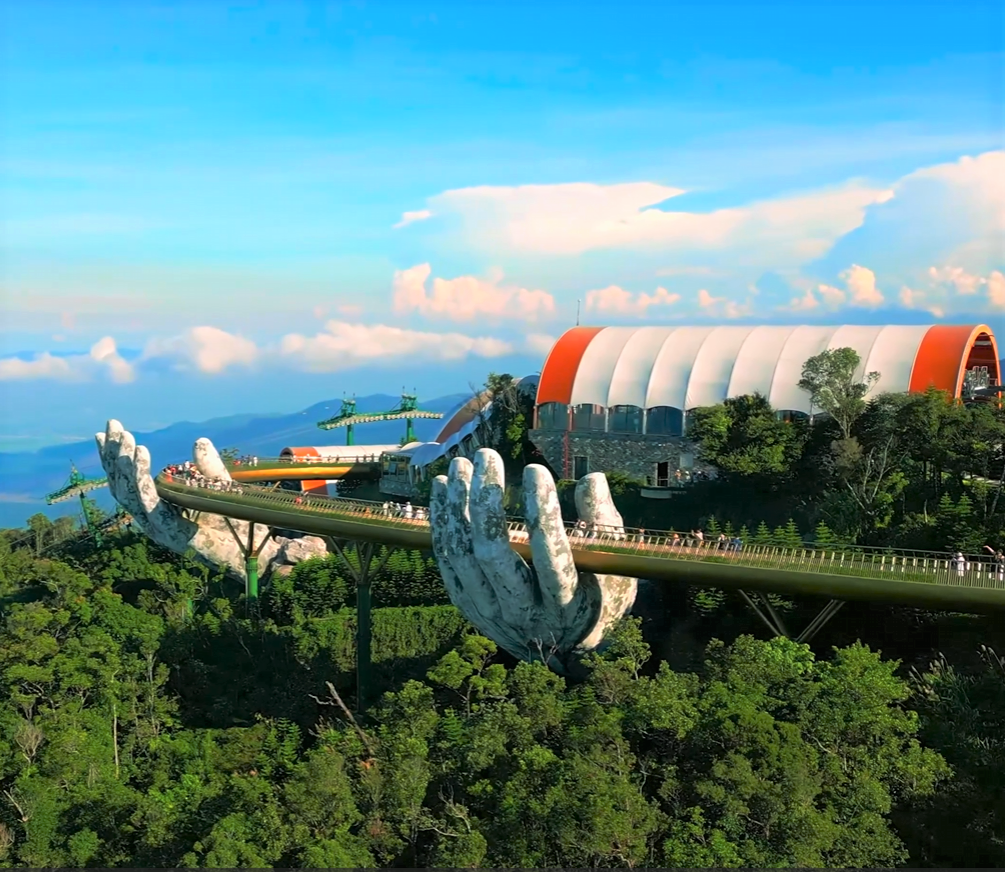 Du khách đến Bà Nà Hills sẽ trải nghiệm hệ thống cáp treo đạt nhiều kỷ lục thế giới, tham quan làng Pháp, vườn hoa Le Jardin D’Amour và đặc biệt là cầu Vàng - công trình nổi tiếng với hình ảnh đôi bàn tay khổng lồ nâng đỡ lối đi giữa lưng chừng núi.