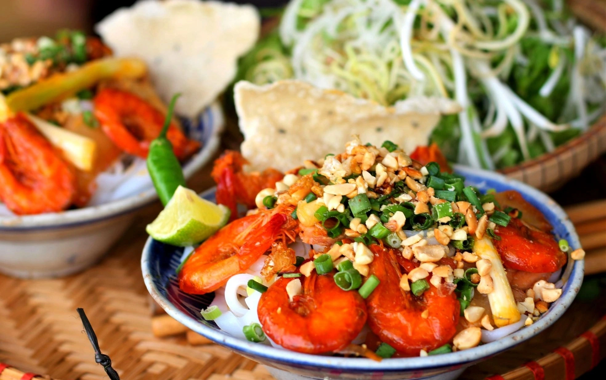 Mì Quảng là món ăn đặc trưng của vùng đất Đà Nẵng - Quảng Nam, nổi bật với sợi mì làm từ bột gạo, bản to và mềm. Điểm khác biệt của món ăn này nằm ở phần nước dùng rất ít nhưng đậm đà nhờ được nấu từ xương, tôm, thịt và gia vị bản địa.