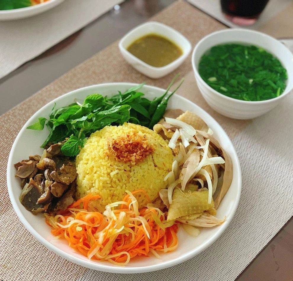 Cơm gà là một trong những món ăn nổi bật nhất của Phố cổ Hội An, gây ấn tượng bởi sự kết hợp hài hòa giữa nguyên liệu đơn giản và cách chế biến tinh tế. Gạo được nấu bằng nước luộc gà nên có màu vàng óng, dẻo thơm và béo nhẹ. Thịt gà ta được luộc vừa chín tới, xé nhỏ rồi trộn cùng hành tây, rau răm và gia vị, tạo nên vị ngọt thanh, không bị khô.